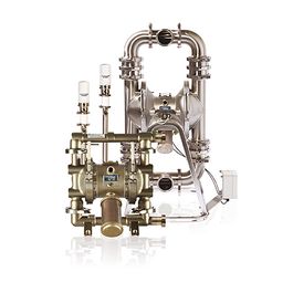 Die Hygiene-Druckluftmembranpumpen der Serie SB, SF bieten ebenfalls alle ein ATEX- und FDA-Zertifikat. Auch hier entscheidet die Materialkonfiguration über ein EC1935/2004-Zertifikat. Diese Baureihe besitzt eine Oberflächengüte von 0,8 µm Ra und ist CIP- und SIP-fähig. Die Hygienepumpen können dank des Standfußes um 180° gedreht werden. Damit ist eine einfache und schnelle Restentleerung möglich. Die SB-Variante ist mit Kugelventilen ausgestattet und die SF-Pumpen mit Klappenventilen. So können Feststoffe mit einem Durchmesser von bis zu 63,5 mm gepumpt werden.