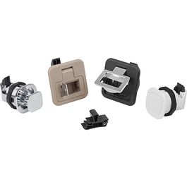 Im Sortiment von KIPP finden Sie Schnappverschlüsse mit klappbarem Griff. Das hat den Vorteil, dass der Griff nicht hervorsteht. Somit kann der Schnappverschluss bündig in Objekte wie Türen oder Klappen eingebaut werden. Gefertigt ist der Verschluss aus Kunststoff und wird durch eine Feder vorgespannt. Ein Klappern bei Vibrationen und Erschütterungen wird dadurch verhindert. Für bestimmte Anwendungen gibt es Modelle mit eingebautem Schloss. Diese abschließbaren Schnappverschlüsse verhindern ein unberechtigtes bzw. unbeabsichtigtes Öffnen. Sie eignen sich für Türblattstärken von 2 bis 22 mm.
